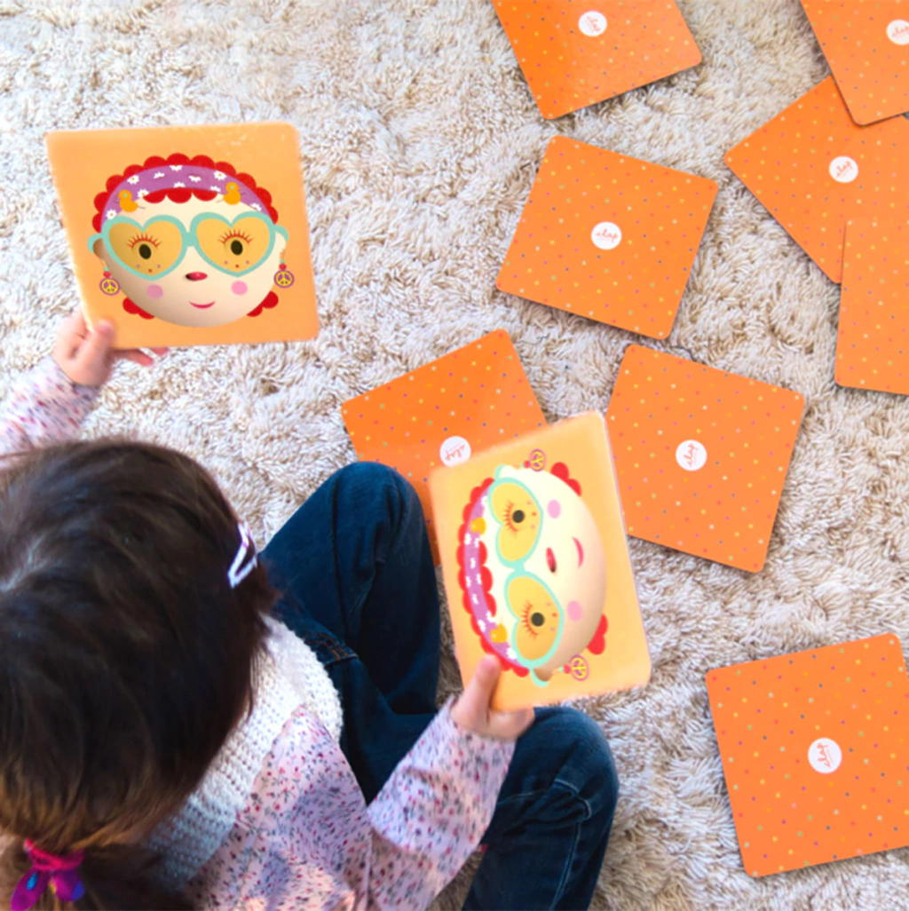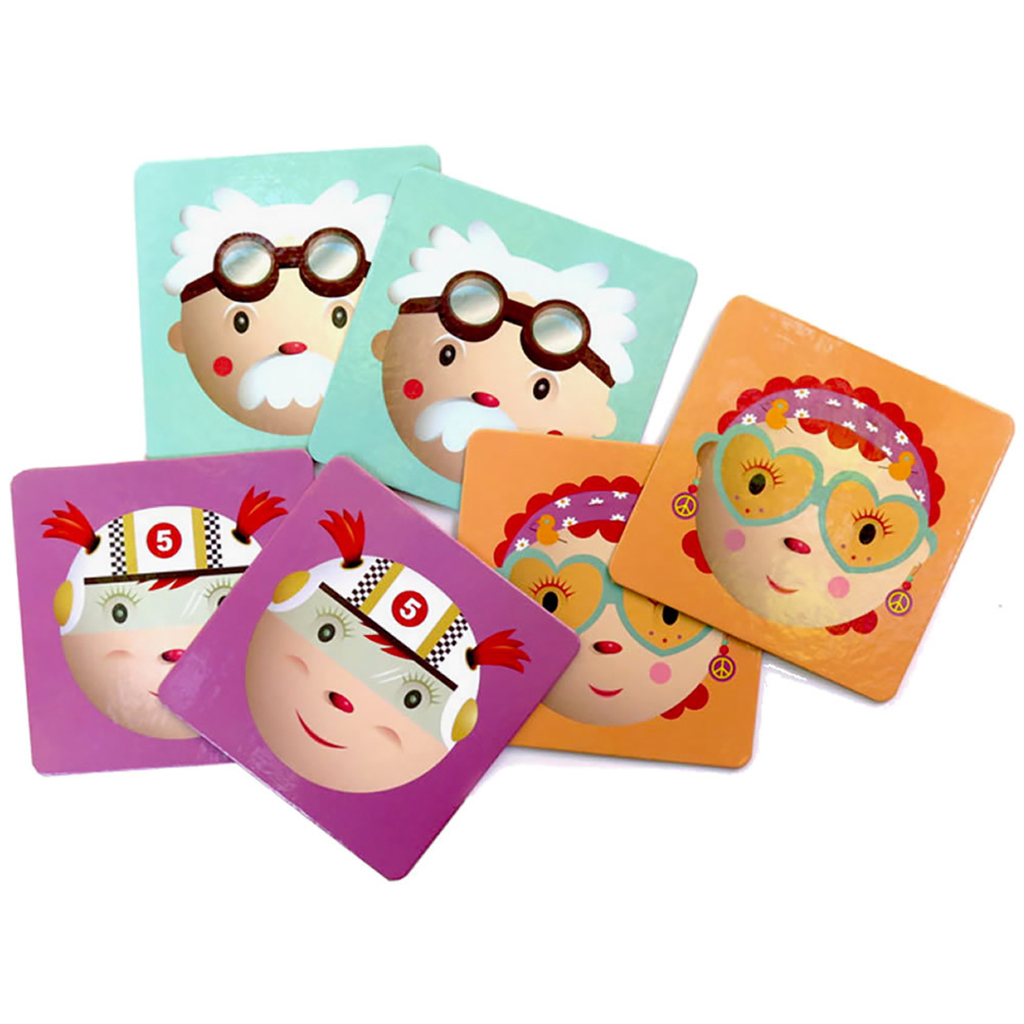 Memo gigante para jugar en el piso . 24 fichas para encontrar dos iguales. 15x15. Impreso en papel ilustración Montado en ambas caras en carton de 2 mm y laminado. Caja de carton microcorrugado + manija.
